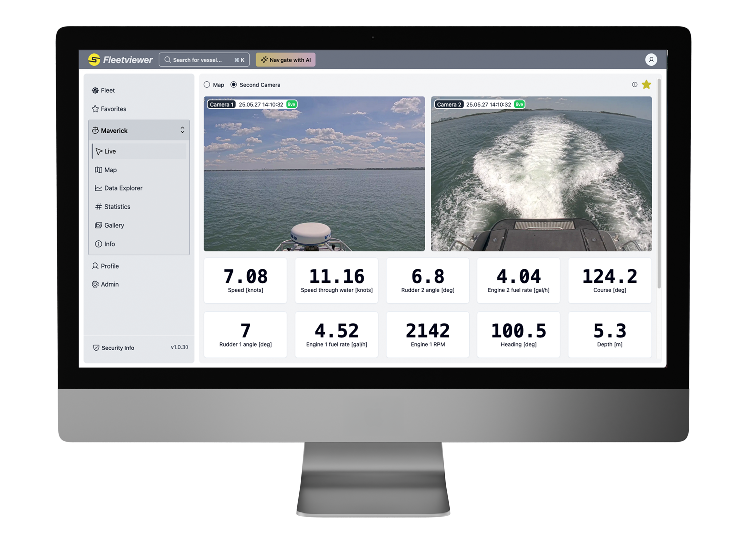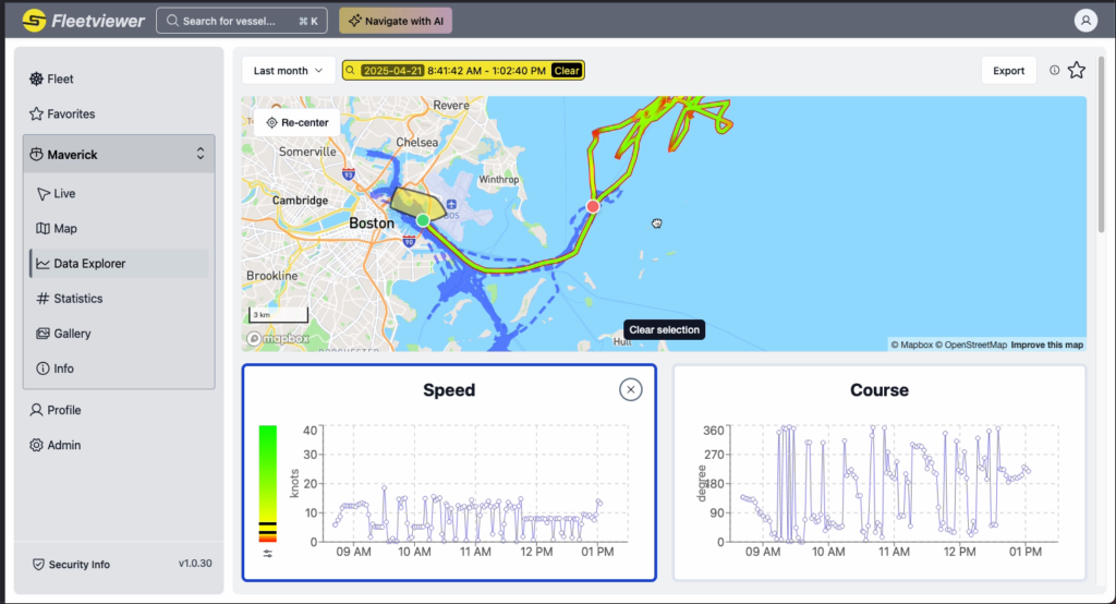 FleetViewer is a browser-based platform that delivers real-time and historical telemetry, onboard systems data, and nearby vessel traffic collected by the SM300 autonomy system.